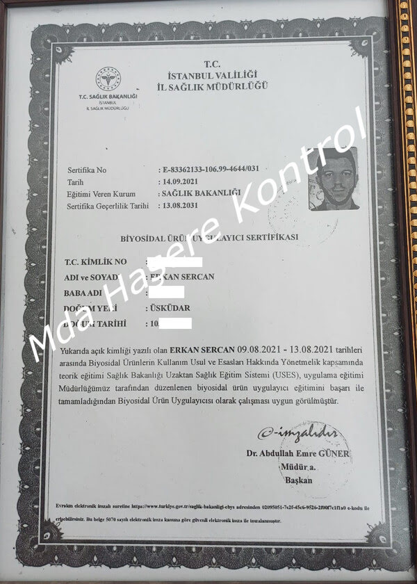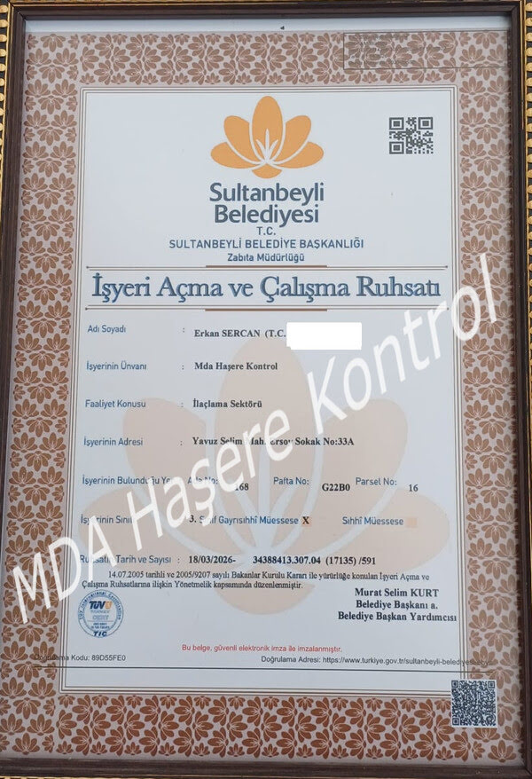 MDA Haşere Kontrol, T.C. Sağlık Bakanlığı onaylıdır. Müşterilerimize en kaliteli ve güvenilir hizmeti sunmak amacıyla sahip olduğumuz yasal izinleri ve resmi sağlık sertifikalarını aşağıda inceleyebilirsiniz.
